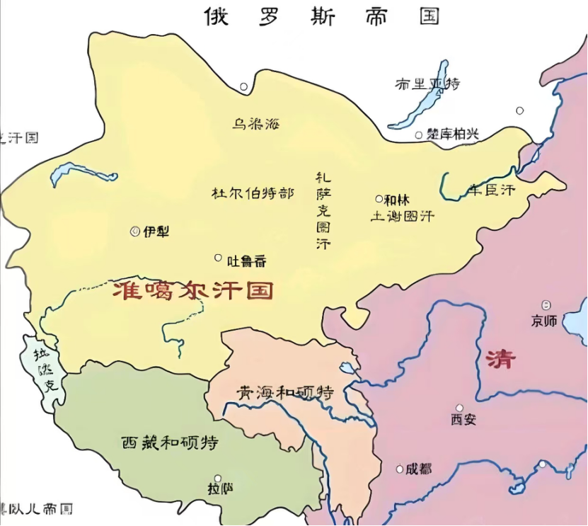 到了明末清初,准噶尔部就慢慢的强大起来,欺凌其他三部。其他三部不堪忍受,就开始往外迁移,有的就迁移到了俄罗斯境内,最远的到了伏尔加河下游。他们本身也是游牧民族,这种迁徙也很正常,逐水草而居。最好能够远离准噶尔部,和硕特部迁到了青海湖地区。那三部一走,准噶尔部就跟着西迁,活动范围就越来越大,东起阿尔泰山,西到里海,南到印度边境,都是准噶尔部的活动范围。