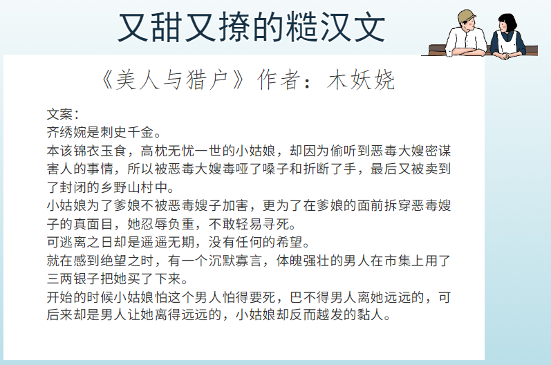 第四本:《美人与猎户》作者:木妖娆,全文36W字点评:这本我觉得是作者糙汉系列最好看的一本了,整体写的也很不错。故事里,女主身为千金小姐,却惨遭他人迫害,在被发卖途中,幸运地被男主像捡到宝贝一样“捡”回了家(男主内心OS:就顺手的事儿,捡就捡吧)。经过一段相处,男女主情愫暗生,从最初的小心翼翼到后来的真心相待。之后,他们携手回到女主家中,成功解决了女主被害的事情,将幕后黑手一网打尽。最终,男女主幸福地生活在了一起,开启了属于他们的甜蜜篇章。怎么说呢,这篇文虽然不能说完美无缺,但整体中规中矩,情节流畅,很值得一看,强烈推荐给大家!