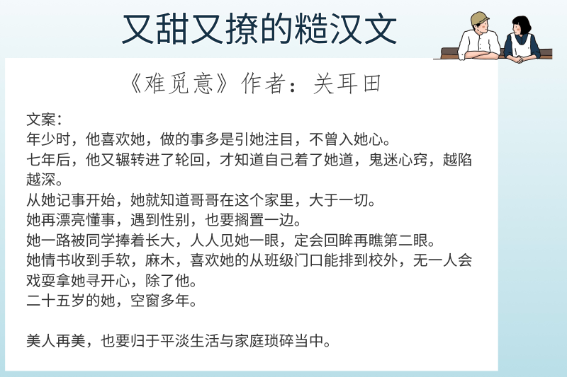 第六本:《难觅意》作者:关耳田,全文30W字点评:这是一本追妻火葬场文,男主是典型的糙汉,女主是高冷的仙女。男主宛如一头不羁的狼狗,初见女主便一见钟情,他是成绩一塌糊涂、整日爱混的学渣,而女主则似一座高冷的雪山,是成绩优异、长相明艳动人的学校女神。