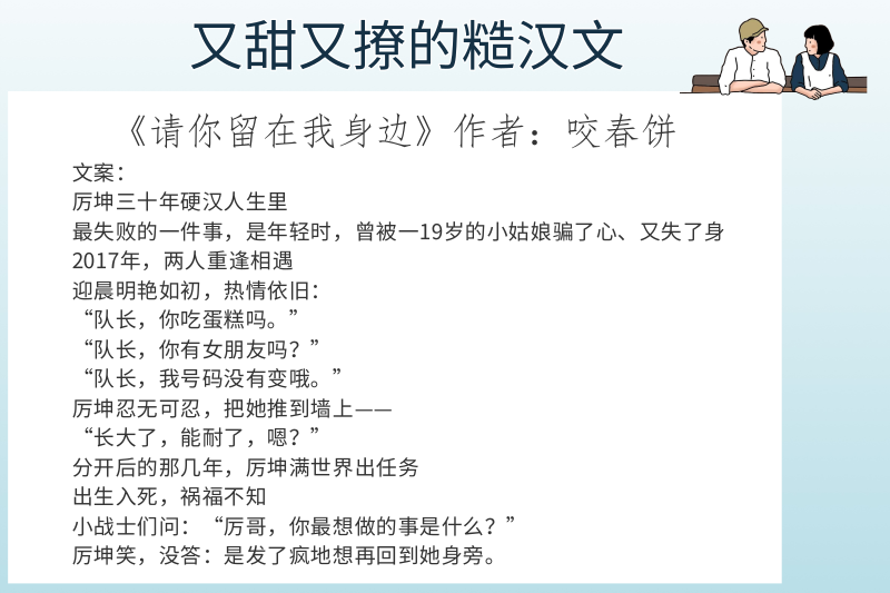 第五本:《请你留在我身边》作者:咬春饼,全文33W字点评:男主特种兵,女主也是军院里长大的孩子。整部小说看下来,女主的形象就像刻在我心里一样,作者对她的刻画那叫一个鲜活生动,仿佛女主就在眼前;再瞧瞧男主呢,这人设着实有些模糊,我绞尽脑汁都想不出个具体的形容,就连男二都比他更有魅力,“苏”感十足。所以啊,要是你是个坚定的男主控,那我可得劝你慎重考虑,这书可能不太适合你。不过话说回来,整体剧情还挺不错的,没有那种虐到肝疼的情节,好多地方还特别甜,妥妥的he结局,喜欢这种轻松甜文的可别错过啦。