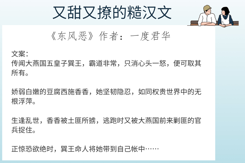 第三本:《东风恶》作者:一度君华,全文33W字点评:真正意义上的古早狗血虐文。 妥妥的渣男配善女,男主那简直能登顶《遇上他倒了八辈子霉》渣男榜!又渣又没责任心,大男子主义爆棚,简直就是个无可救药的傻缺。除了打仗有点本事,就再无其他优点,可就连打仗还净干抢自己人功劳这种缺德事。女主香香呢,那是温柔得能把直女都掰弯的贤惠姑娘,有着野草般顽强的生命力,本应像盛开在阳光下的鲜花,无比绚烂。要是没碰上这男主,她的人生说不定能绽放出更耀眼的光芒。 不得不说,老作者这文笔是真牛,把人物塑造得活灵活现,看的人那叫一个咬牙切齿,只想大声喊:香香快跑啊,别再被这渣男给拖累了!这种反差感拉满的剧情,真的太让人上头了,就像着了魔一样,根本停不下来,一心就盼着女主赶紧摆脱渣男,走向新生。