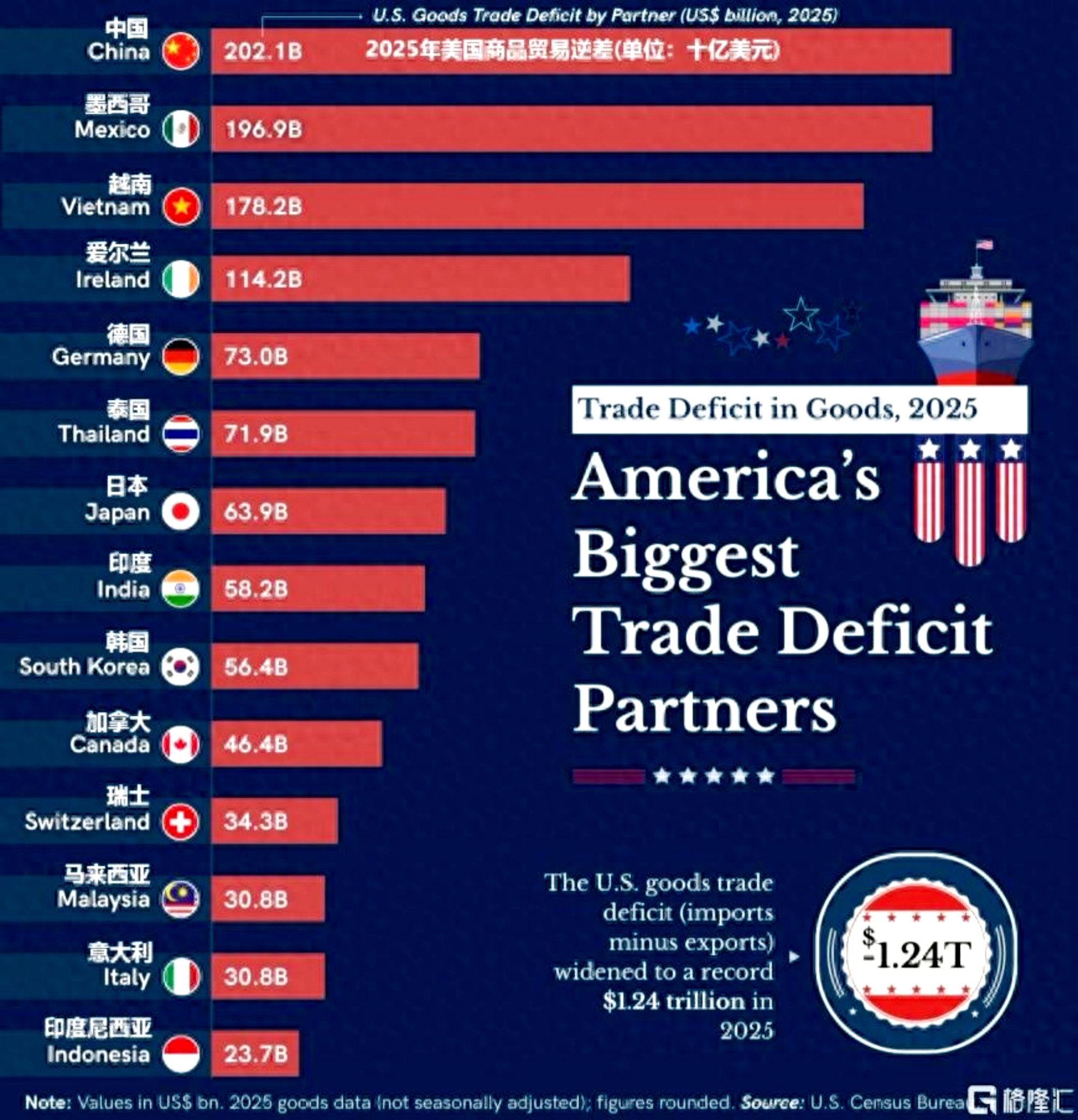 2025年,美国的商品贸易逆差达到创纪录的1.24万亿美元 源自格隆汇