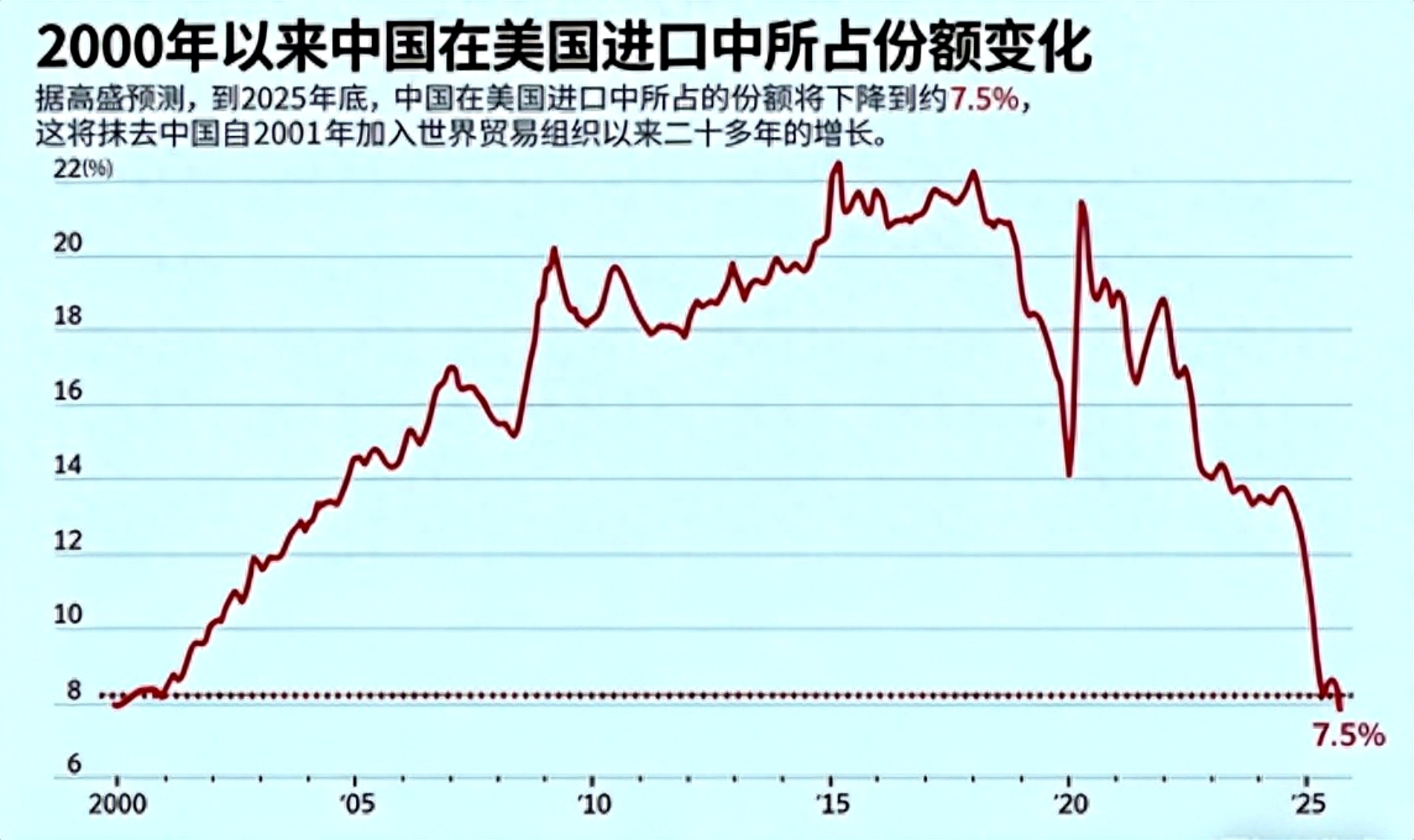 第二,中美贸易总额持续下降,美国占中国贸易份额加速萎缩美国已经降至中国的第三大贸易伙伴。中美贸易额仅占中国GDP总量的2.5%。中国国家统计局公布一组中美贸易数据,中国对美国出口额占出口总额比重,从2018年特朗普对中国抡起关税大棒的时刻起,已经从19.2%已降至2025年的8.8%,较2024年的11.17%进一步下滑。中美贸易占中国对外贸易总额的占比,已经从最高的19.75大幅降至8.1%。