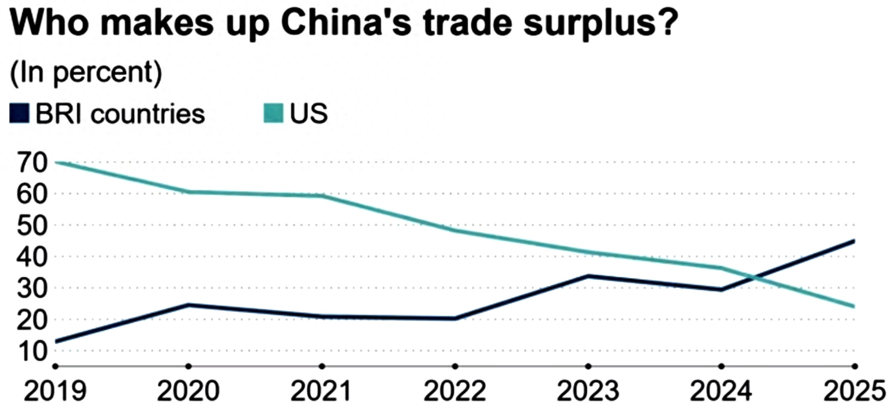 第三,美国在中国贸易格局中的地位显得越来越无足轻重美国CNN坦承,作为全球最大的制造业国家,中国在2025年顶住了美国贸易政策带来的压力。中国出口强劲,这主要得益于对非美国市场出口额增加,且生产商寻求扩大全球范围内的业务规模,以抵御美国政府的关税压力。