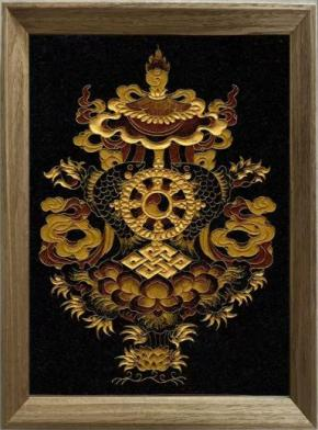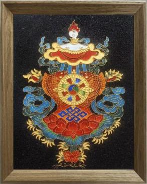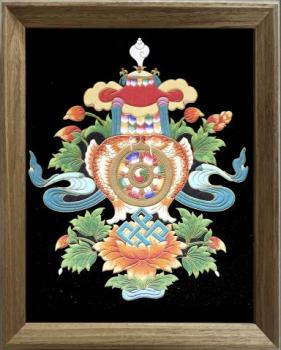 吉祥八宝又称 “八吉祥”,是藏地千年传承的经典吉祥符号,由宝瓶、宝伞、吉祥结、法轮、金鱼、莲花、法螺、胜利幢八件信物组成,每一件都承载着古人对美好生活的真挚期许。而天虞非遗深耕热贡唐卡技艺,严格恪守传统仪轨,将这八件吉祥信物,通过纯手工掐丝工艺,精心雕琢在方寸画布之上,成为中华优秀传统文化的鲜活载体。