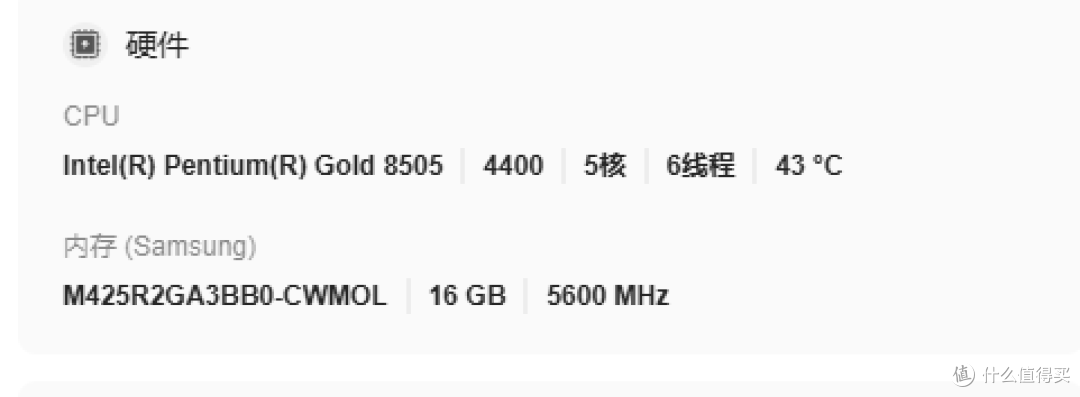 处理器 方面是老英家的奔腾金牌8505 处理器,5核6线程,最高睿频4.4GHz。集成Intel UHD Graphics核显,4K解码,视频转码,多任务处理、Docker部署和虚拟机不在话下。