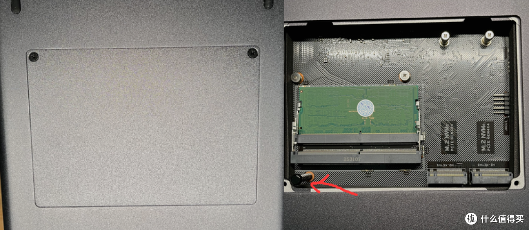 接下来说说底部,话说绿联到底藏了多少惊喜在这台机器上,底部设计突出一个巧字,首先底部是加装内存和nvme硬盘的地方,工艺上做到了严丝合缝,然后盖板这里加了一个小弹簧,这个装盖板的时候,怎么说呢,不是咔一下掉下去,而是慢慢的下去,设计感真是让人身心愉悦。