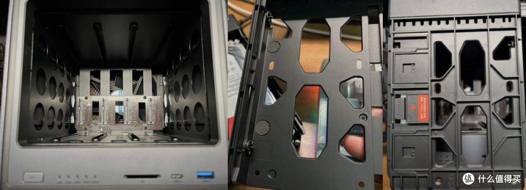硬盘笼和盘架方面,质感极佳,首先硬盘笼中导轨设计间距合理,背面风扇可以中庭直吹,南北通透,方便散热,盘架方面用料扎实做工极佳,推拉设计方便硬盘固定,再也不用拧一堆螺丝了,而且固定后非常紧固,硬盘放里面再安全不过。