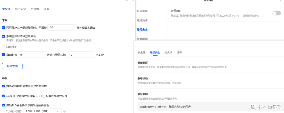 在安全性方面,绿联除了双重验证,还有dos保护,查看账号活动,账号封锁,提高连接安全性,把安全性设置设置在显眼位置,看出来绿联对用户数据安全性的重视。