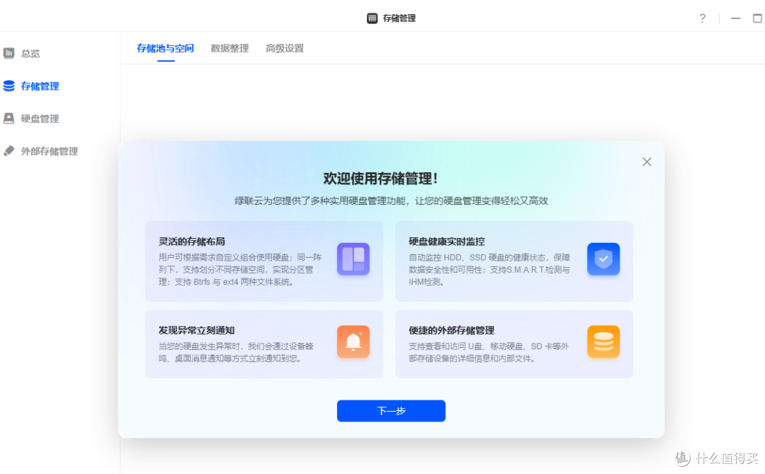 然后就进入绿联云系统了,nas第一步,建立存储库,这里建议重要数据多备份,绿联给了4+2盘位,咱们大可以nvme盘放常用数据,重要数据组raid加321备份nas本地网盘冷备,一般的数据就basic加网盘备份。