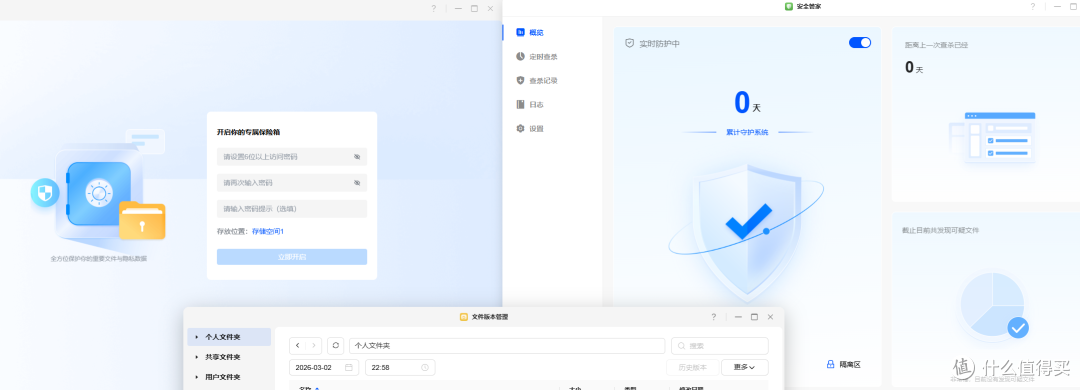 除了安全性设置外,绿联的保险箱,安全管家,文件版本管理器三大护法,一个注重数据隐私,一个注重数据安全,一个注重事后补救,恢复文件。其中保险箱为了防止你忘记密码会给一个key文件下载让你保存,因为忘记密码你权限再高也看不了里面的文件了。