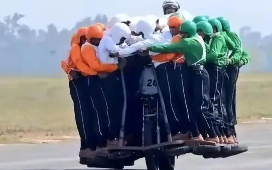 色彩鲜艳的头巾随风飘动,士兵们摆出突破人体极限的造型,一辆摩托车载着 58 人行驶 1200 米,还顺手创下吉尼斯世界纪录。