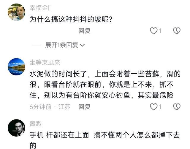 还有网友说:水泥做的时间长了,水面会附着一些苔藓,滑的很,眼看台阶就在眼前,你就是上不来,抓不住,别以为有台阶你就安心钓鱼,其实最危险。
