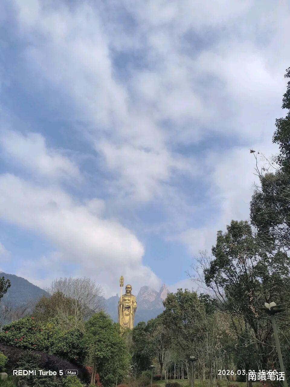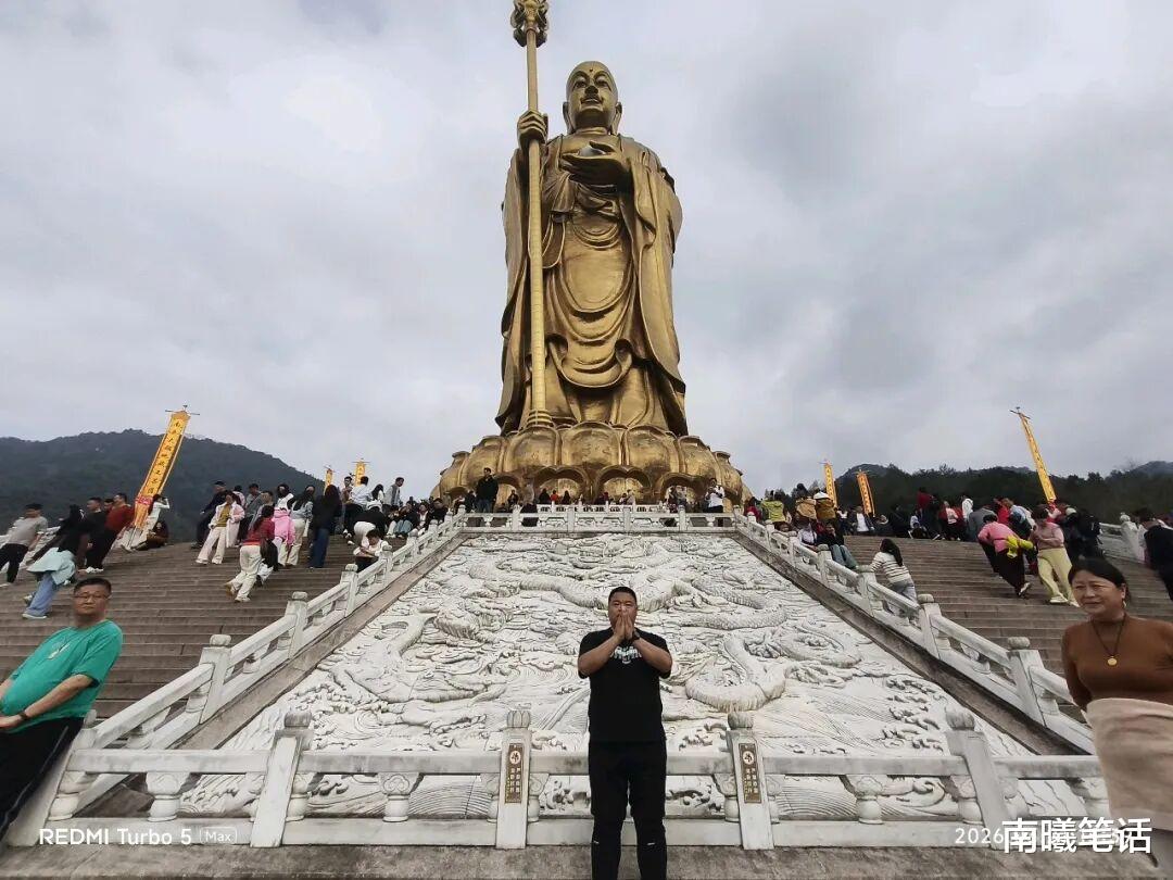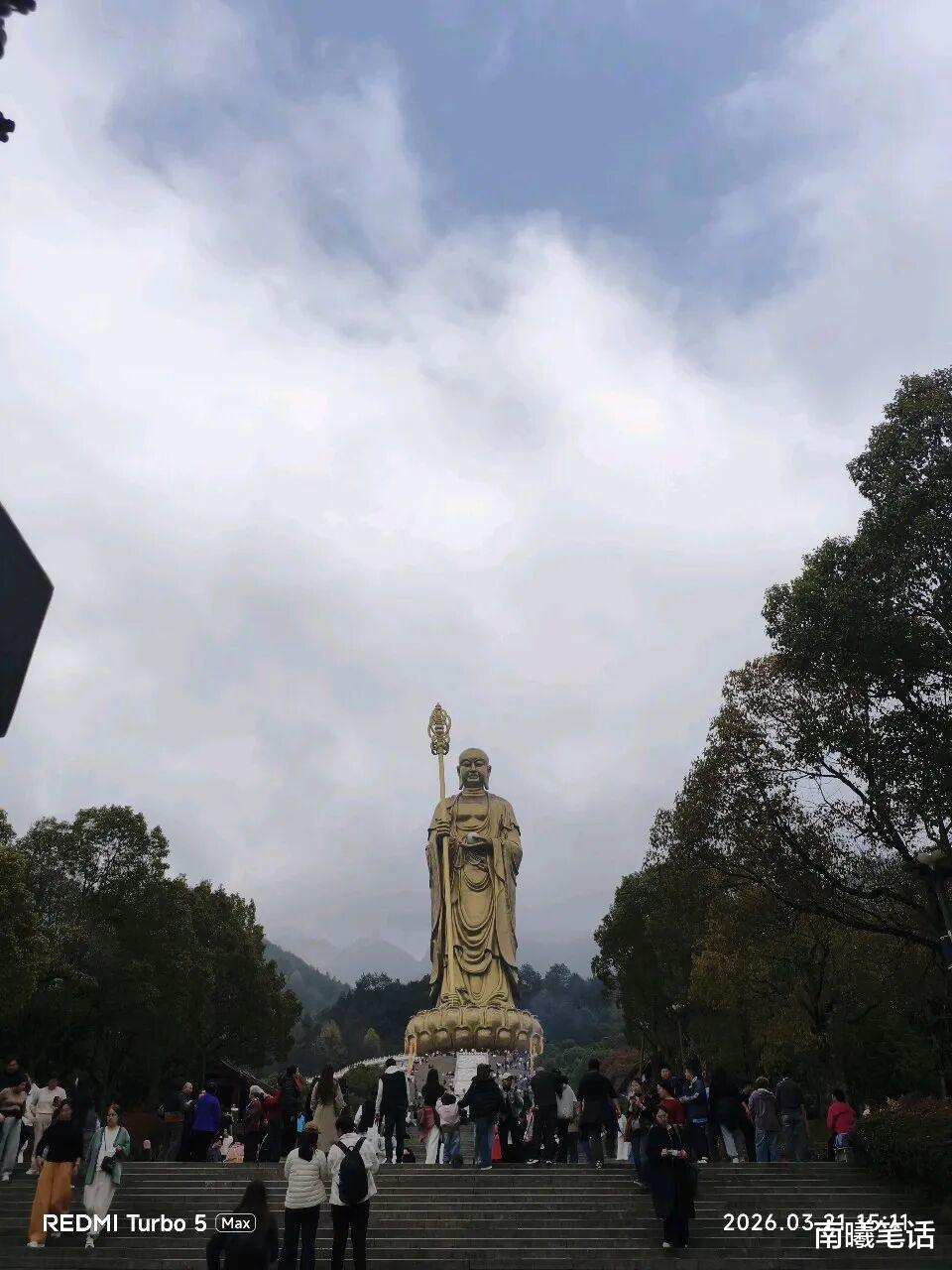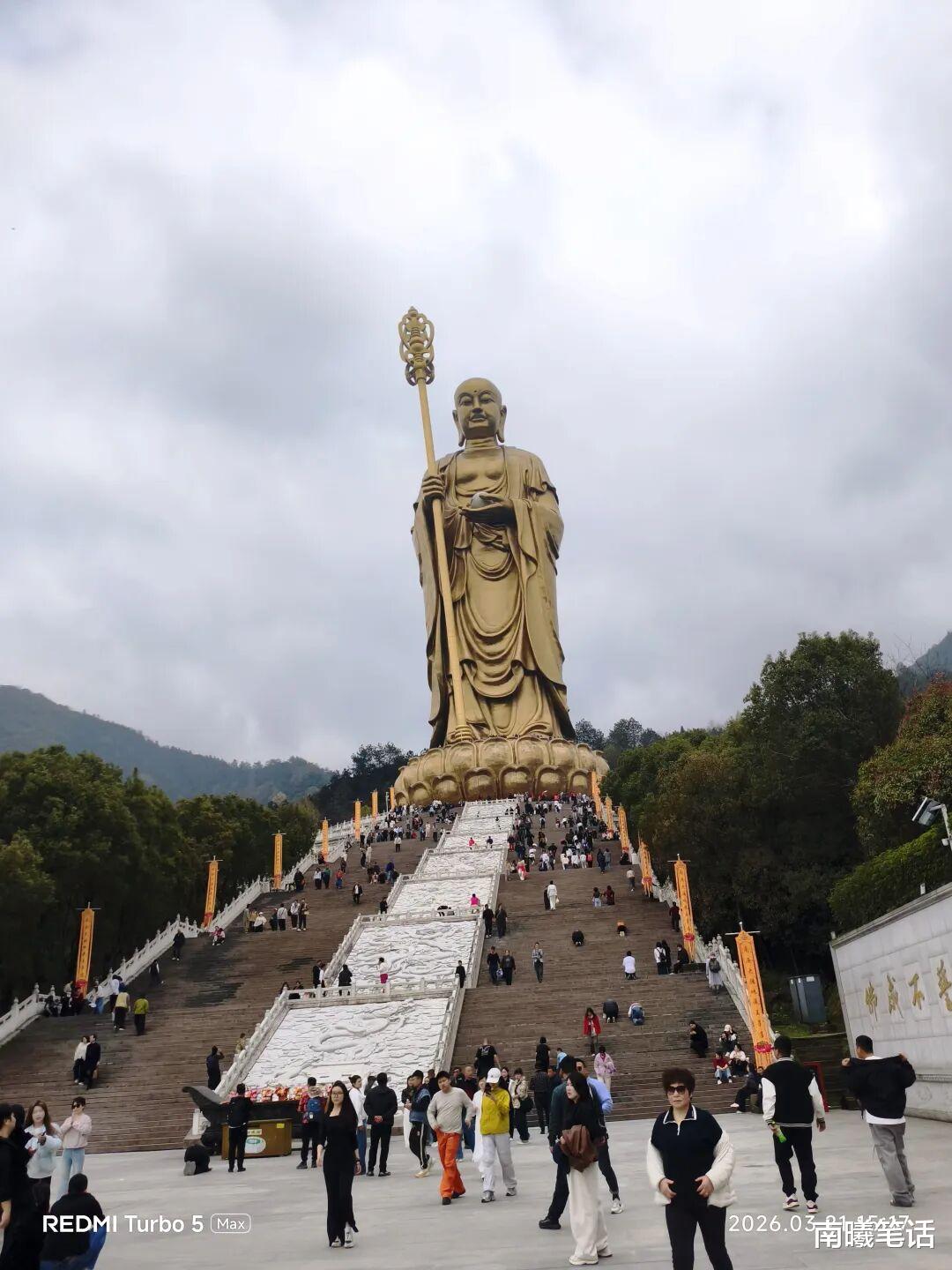 我首先来到了九华山游客中心附近的大愿文化园。踏入园中,一座宏伟壮观的地藏菩萨塑像映入眼帘。这座塑像的筹建始于1995年,由顶峰国际规划设计公司精心承担景区规划设计。像体总观瞻高度达139米,堪称世界第一高地藏菩萨露天铜像。其中,铜像像身高度84米,加上莲花座底盘高度99米,是世界上最大最高的佛教造像之一。
