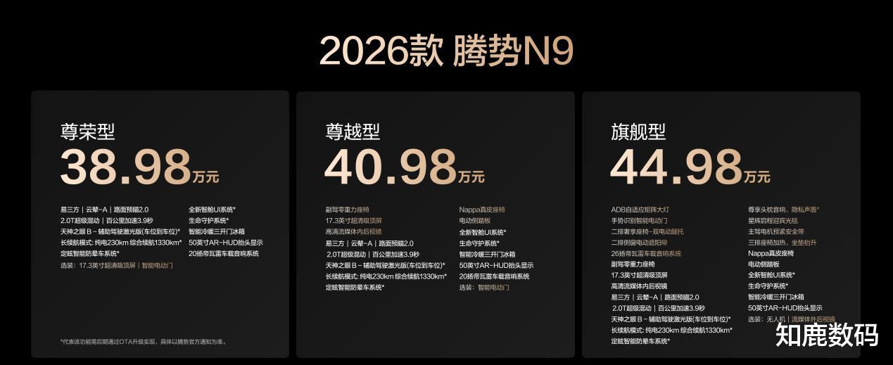 9月17日晚,2026款腾势N9正式上市,本次共推出尊荣型、尊越型、旗舰型3款车型,定价38.98万元~44.98万元。