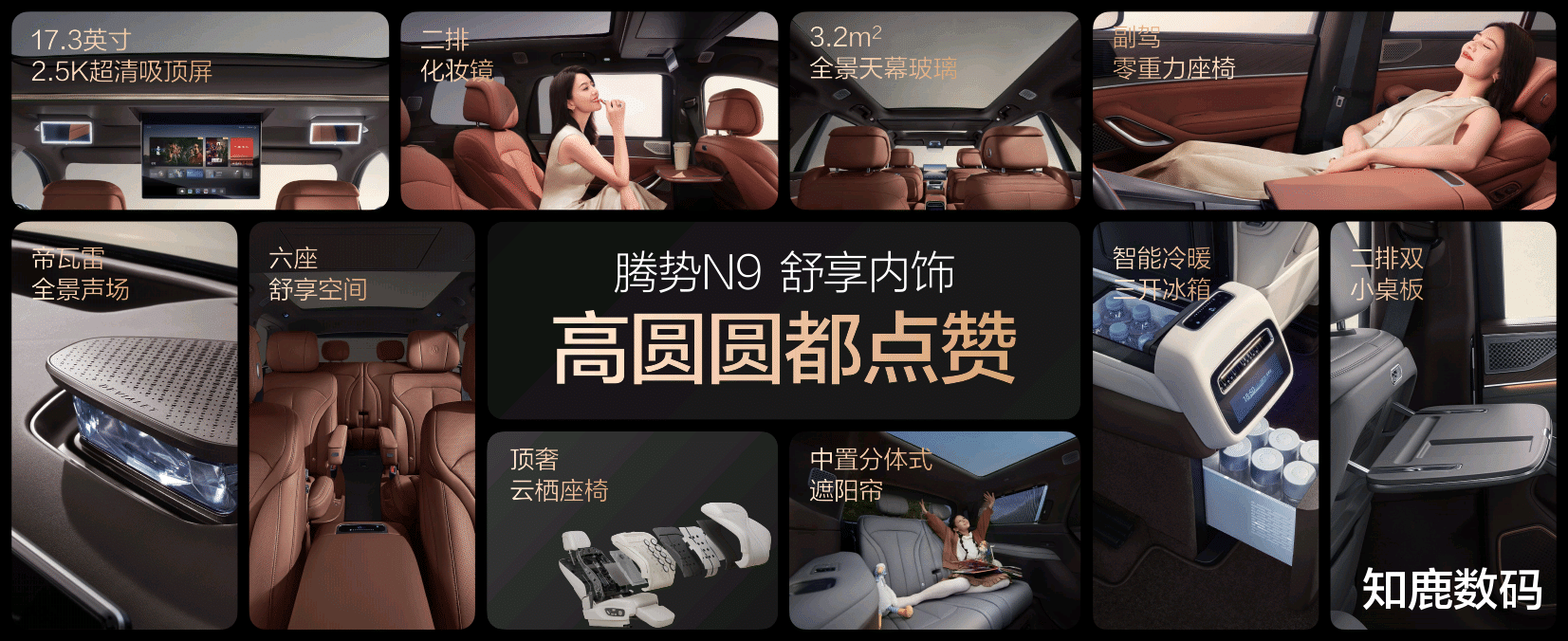 2026款腾势N9全系标配易三方、云辇-A、天神之眼 B、插混专用2.0T高效发动机等配置,搭载定眩智能防晕车系统、车位到车位领航辅助等功能,堪称超级混动豪华新座驾。尊越型还增加了副驾零重力座椅、17.3英寸2.5K超清吸顶屏、高清流媒体内后视镜、NAPPA真皮座椅、电动侧踏板等配置,定价40.98万元。