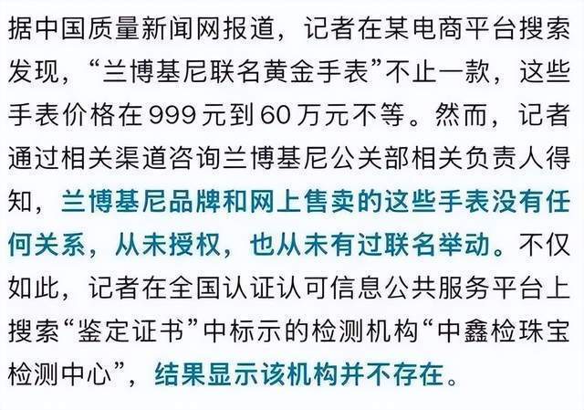 随后,深圳市市场监督管理局宝安监管局调查发现涉事企业未在登记地址经营,平台网店已关闭,经检查,发现一涉嫌生产销售“兰博基尼联名手表”的企业,现场查获一批无厂名厂址、无执行标准的手表,执法人员已依法扣押,并就涉事企业与华锐兰博的关联合作关系做进一步调查。