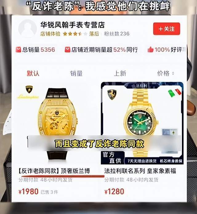 “反诈老陈”表示,此事更令他气愤的是,在他揭露售假后,商家不仅没有立刻下架相关商品,还在售卖页面加上了“反诈老陈同款”的字样。