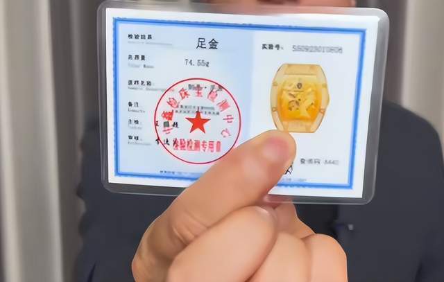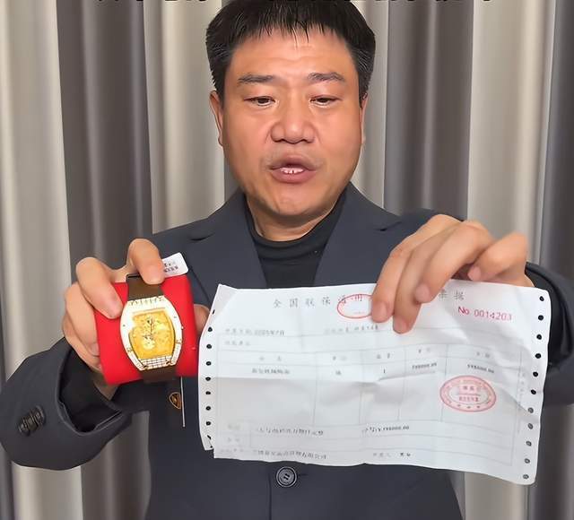 视频中,他购买的这款手表标价1980元,表身有“999足金”的字样,并配有一张“鉴定证书”。直播间导购展示的收据上,还印着“兰博基尼售后专用章”字样的红章。