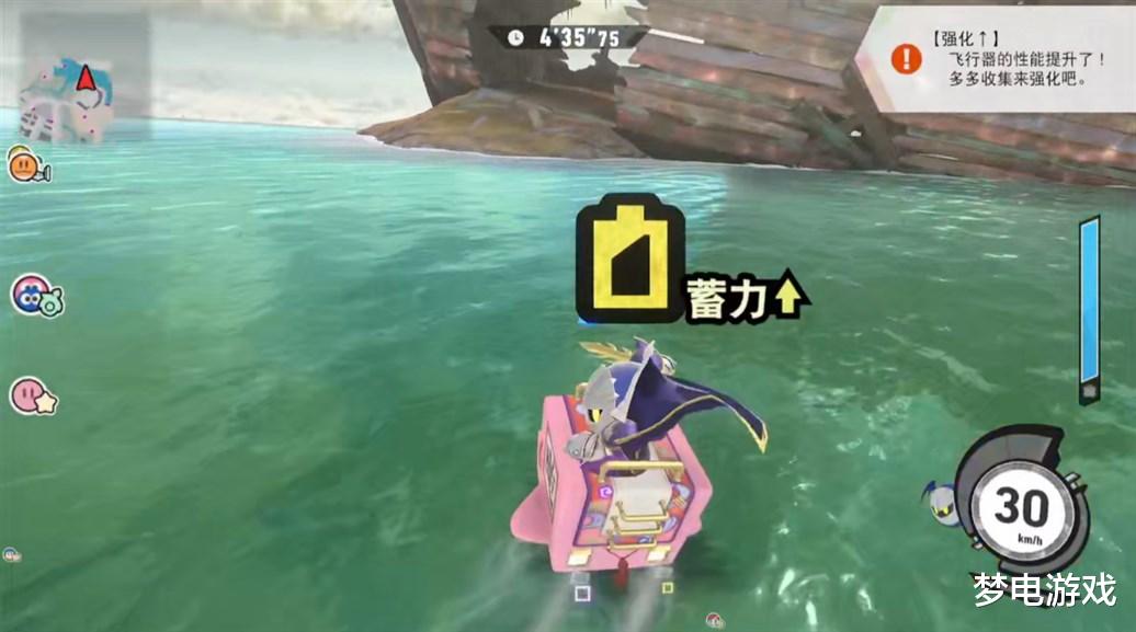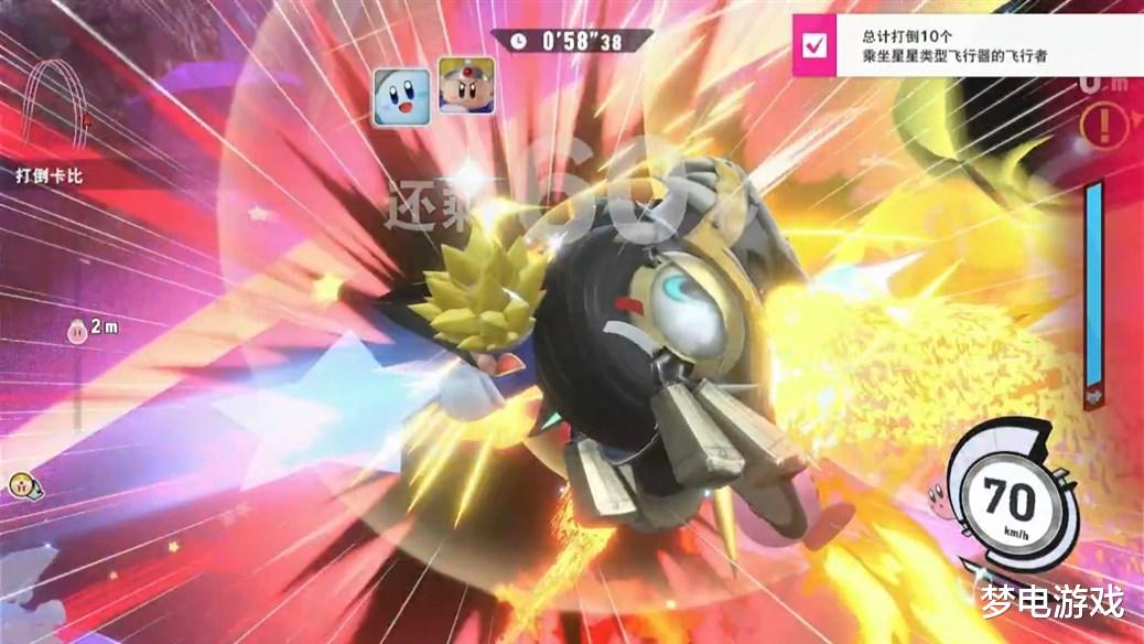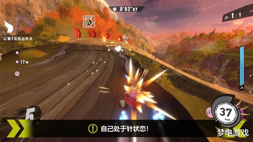 更重要的是,长按B键接近前方的敌兵或道具,卡比经典的“吸入”能力便会发动,将目标转化为己用的武器或者一发炮弹。而一旦吸入能力,再次按下B键便能施展相应的攻击,无论是近身劈砍,还是远程火弹,熟悉的技能在赛车上有了全新的表现。