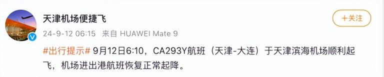 9月12日,天津滨海国际机场发文:6时10分,CA293Y航班(天津-大连)于天津滨海机场顺利起飞,机场进出港航班恢复正常起降。