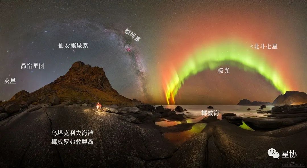 天空中这二道庞大的拱形光弧是什么?左侧是我们较熟悉的银河系中央盘面;它是由众多银盘恒星和星云汇集而成,在影像里看似几乎环绕整个南天的光带。银河拱的下方,则有锈红色的火星和弥漫的仙女座星系。【星协科普】然而这个酷寒的极区夜晚另有其他精彩之处。在短短的数分钟期间,由极光聚成、伸展在北天的复层拱形光弧,突然出现在影像右侧。很显然的,地球大气高层的极光,远比恒星要邻近。在泛绿的极光拱弧上方,则可见到构成北斗七星的一群恒星。这幅主题影像,组合自2022年11月中旬摄于挪威罗弗敦群岛的20张照片。