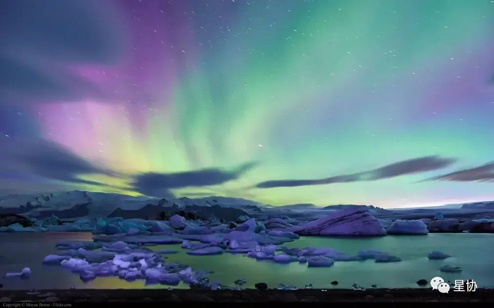 极光,是由80~500公里高空的电爆引起发的光现象。地球的“磁南极”和“磁北极”构成的强大磁场是呈弧形磁力线作螺旋运动移向两极,从而使极地上空大气层若干气体发出光芒。根据关于极光分布情况的研究,极光区的形状不是以地磁极为中心的圆环状,而是卵形。极光的光谱线范围约为3100~6700埃,其中最重要的谱线是5577埃的氧原子绿线,称为极光绿线。【星协科普】大多数极光出现于地球上空90-130千米处。1959年,一次北极光所测得的高度是160千米,宽度超过4800千米。但有些极光要高得多,高度可达560-1000千米以上。