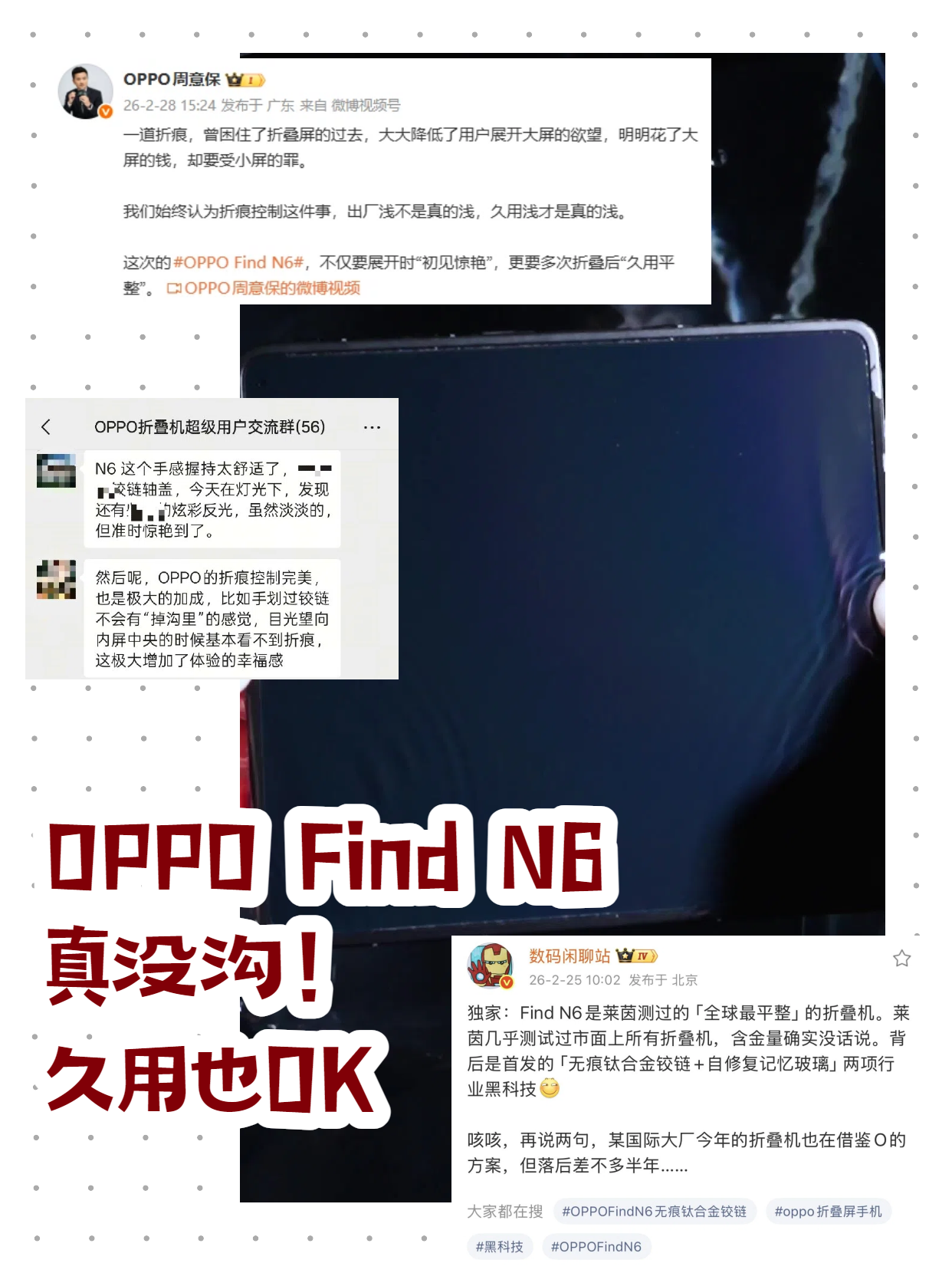 自从站哥说OPPO Find N6已经通过莱茵实测,迅速Get到“全球ZUI平整”的称号之后我就开始期待了,结果这回看完周意保发的视频发现自己还是准备少了!知道它无痕但没想到这么无痕!真就没沟啊!!