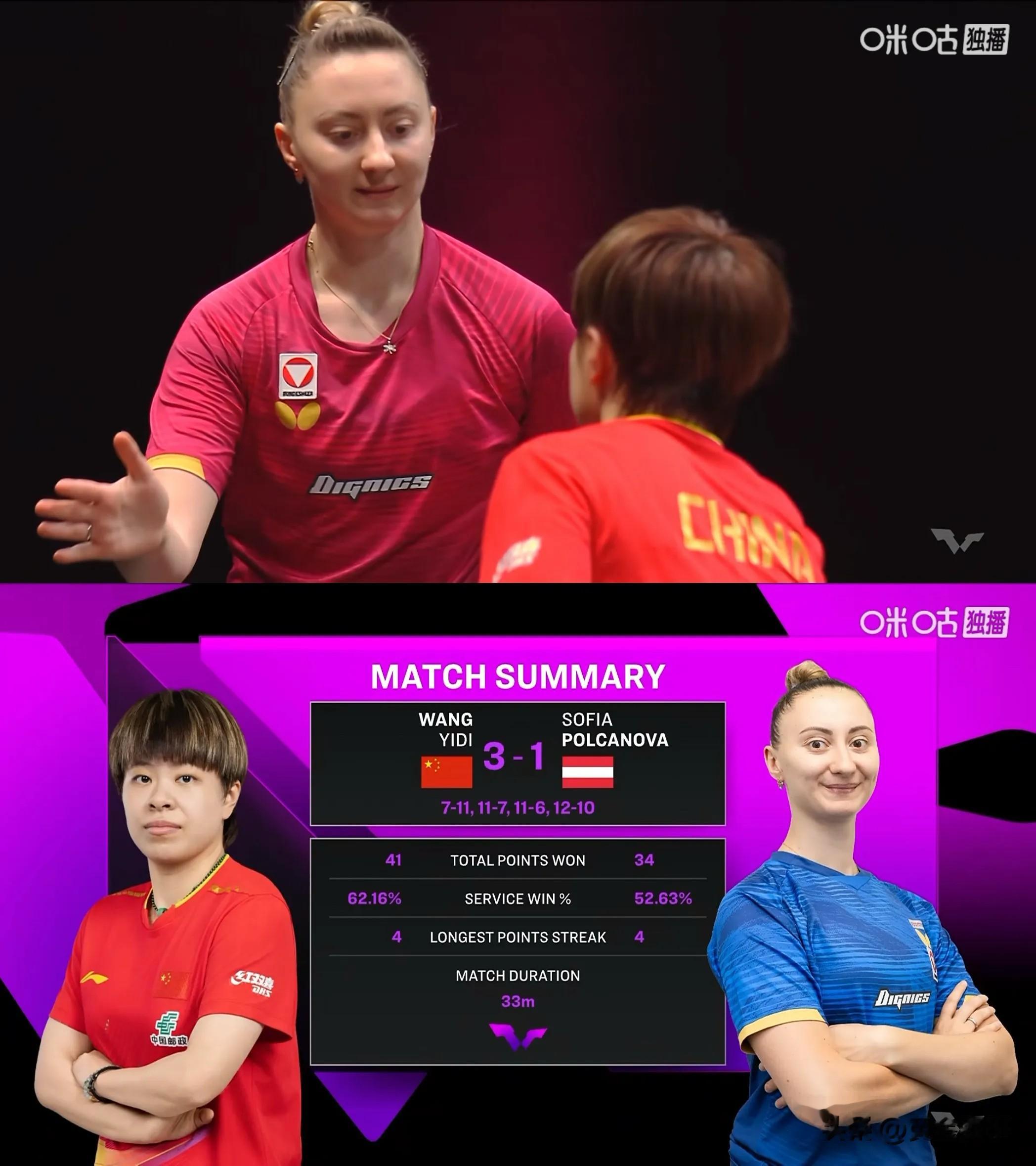 最后两分都是通过多板相持拿下的,我并没有冒险变线或搏杀,就是坚持压住中路,依靠衔接和稳定性,波尔卡诺娃在关键时刻也打得很凶,但可能我处理得更耐心一些,关键分的胜利,往往属于战术执行更坚决、心态更稳定的一方。