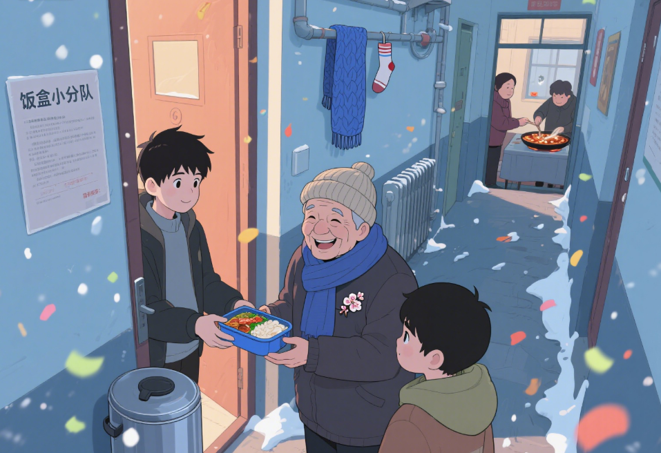 冬天的阳光,透过窗户照进来,落在蓝色饭盒上,泛着淡淡的光。我知道,这个冬天,不会冷 —— 因为有张阿姨的爱,有邻居们的温暖,有这传递不息的蓝色饭盒,像团火,暖着我们每个人的心。