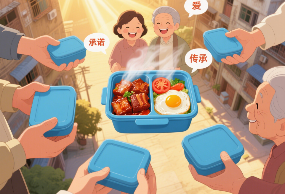 上个周末,我们给楼里的张奶奶送饭菜,她已经九十岁了,儿女都在国外。她打开蓝色饭盒,看着里面的红烧肉,笑着说:“这饭盒,我认识,是张兰的。她以前总给我送红烧肉,说‘张奶奶,您牙不好,我炖得烂烂的’。现在看到这饭盒,就像看到她一样。”