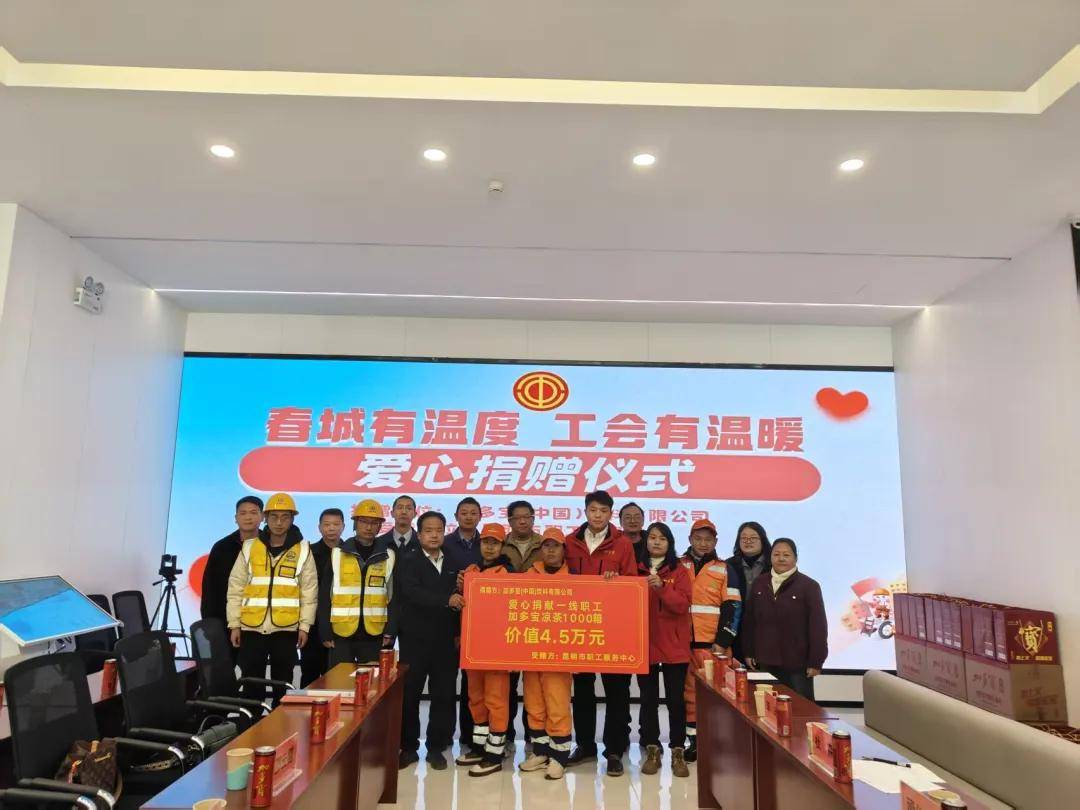 随着春节的脚步临近,为了让坚守一线的劳动者感受到节日关怀与工会温暖,2月10日,一场以“春城有温度 工会有温暖”为主题的捐赠仪式在昆明市职工服务中心温暖启幕,昆明市总工会搭建起爱心桥梁,联动爱心企业加多宝(中国)饮料有限公司以实际行动诠释“春城温度”和“工会温暖”,为奋战在各个岗位上的一线职工送上新春祝福。