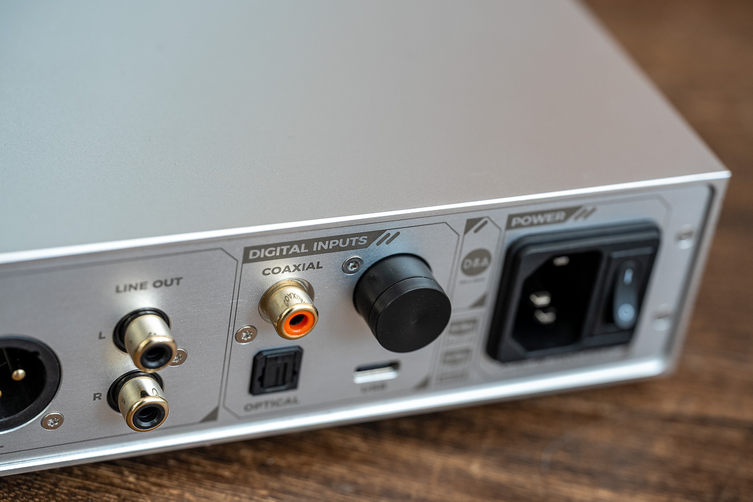背面部分,收窄了的体积依然保留了XLR平衡输出自然是个惊喜,此外就是常见的RCA输出以及USB、蓝牙、光纤、同轴的信号输入,其中蓝牙的部分做了隐藏式天线,只是USB的部分采用的是USB-C口,而不是传统台机厂家更常用的B口。电源的部分使用了一个竖置的方式,且即便是我使用一些插尾很粗的美标电源线也不会挡着开关口,这一点给好评。