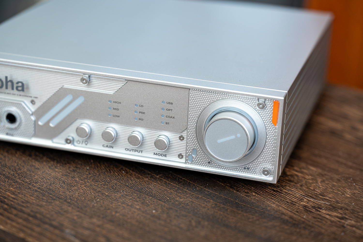 Alpha的外观给人的感觉是复杂而有序,充满了线条与几何之美,恰到好处的灯光非常增色,而且也是尽可能地“螺狮壳里做道场”,正面板因为收窄了以后,砍掉了XLR耳机孔,改为了6.35+4.4,其中有一点我非常欣赏的地方在于,虽然Alpha看似是一台设计很新派的机器,却在功能操作上非常的“old school”,正面提供了充沛的物理按钮和对应的指示灯与当前状态的标识,比起那种给到你一个小屏幕来选、或者极度依赖遥控器来操作的机器,Alpha绝对称得上是简单粗暴程度的好用。当然了,作为具备模拟前级功能的硬件设备,它的短板也在于不能通过遥控器来调整音量,所以设计初衷应该就是一台“手边的桌面设备”,对两声道系统用户不那么友好。