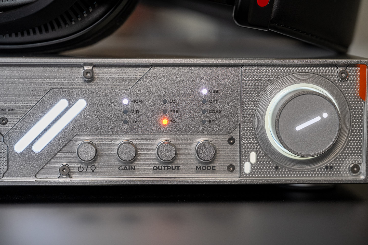而这次Alpha比Alpha Pro多出了一个“TONE-X”音效模式,官方给的描述是注入适量谐波、提升韵味,是偏模拟的风格,我个人听下来是觉得说它“模拟味”可能有些夸张,但从听感角度来说,它在绝大部分的音源和搭配下,都是可以带来正向听感的,我甚至觉得密度表现比标准模式下要更好,它会轻微加强空间混响、器乐的泛音,并且抹除一些其中可能存在锯齿感的东西、让能量感趋于线性和平顺,包括对渣音源的录音也更友好。平时我基本上会选择把它常开,通过长按output即可实现,此时橙色的指示灯会亮起,这个灯效不仅漂亮、而且还可以带来一些正面视觉的反差感。