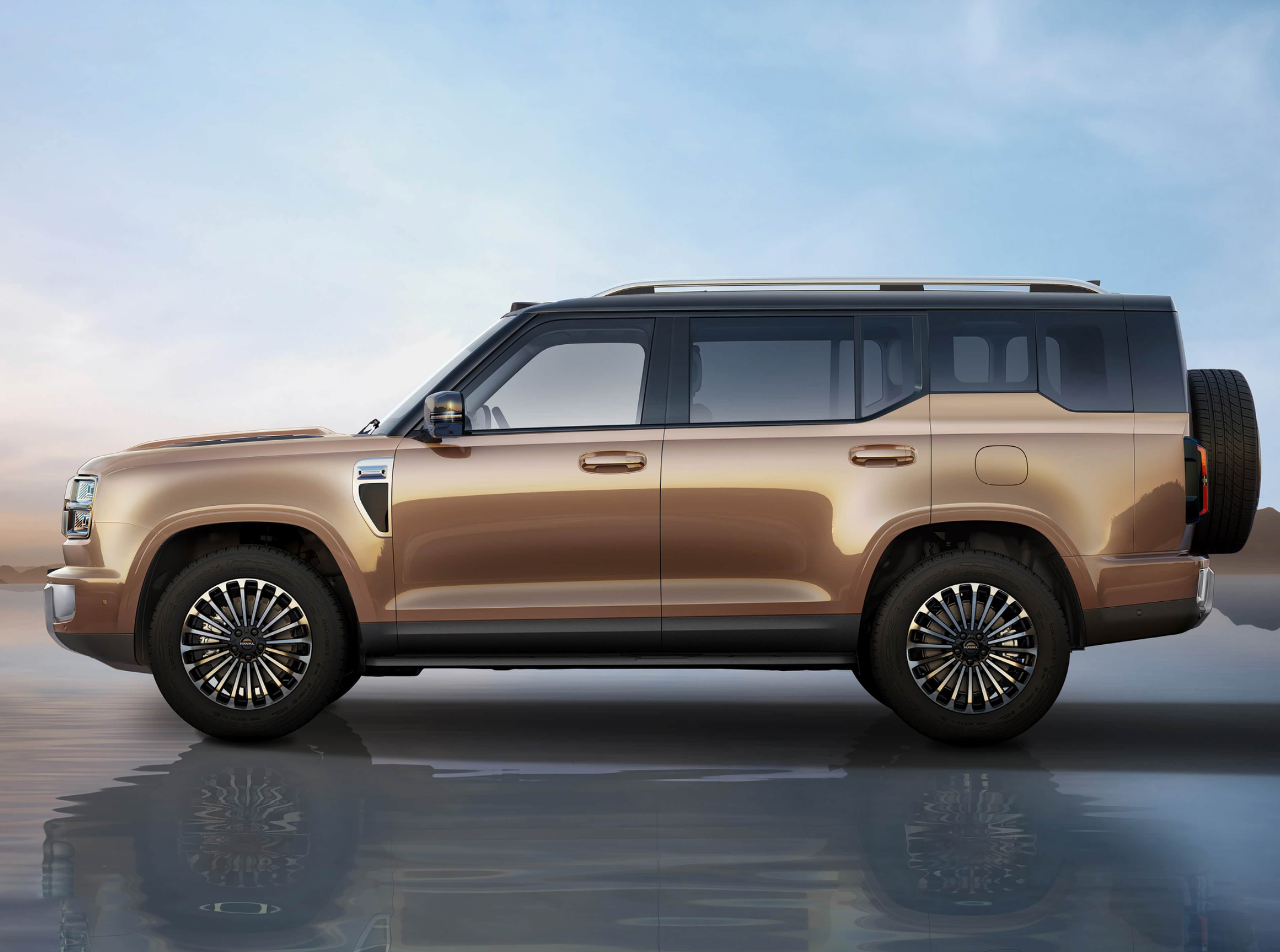 车身侧面,哈弗全新SUV采用了时下流行的方盒子轮廓,通过大量大量平直的线条勾勒,采用了平行于地面的黑色车顶,还加入了银色金属材质的全尺寸行李架,A柱倾斜角度更大,B/C/D柱采用了垂直于地面的加宽设计,黑色的中柱与黑色的车顶共同形成了悬浮式车顶的立体视觉效果。笔挺的肩线从前舱盖横向贯穿车身一直延伸至尾灯上沿,前翼子板加入了银色金属徽标,平行的双腰线让车门型面形成了内凹的样式,凹凸有致的设计更加立体。黑色的侧裙、大尺寸密辐式铝合金轮毂匹配了大尺寸银色刹车盘和银色刹车卡钳,提升了整车的硬派气息。从官方图片来看,该车拥有更加出色的接近角、离去角和纵向通过角,空载离地间隙也将会超过200mm,是一款兼顾城市通勤,又能去郊外越野的车型。