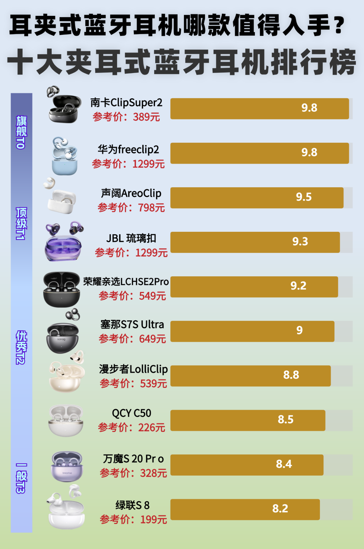 如今耳夹式蓝牙耳机凭借佩戴舒适、运动不掉、不伤耳道的优势,越来越受大家欢迎。但市面上产品种类繁多,价格从几十到上千不等,很多人既想选到音质好、续航稳的款式,又担心价格太高不划算。为了帮大家花更少的钱买到体验靠谱的耳机,我整理出十大公认最好的夹耳式耳机排名,兼顾好用与实惠,覆盖不同预算,让普通人一眼就能选到高性价比的合适机型。