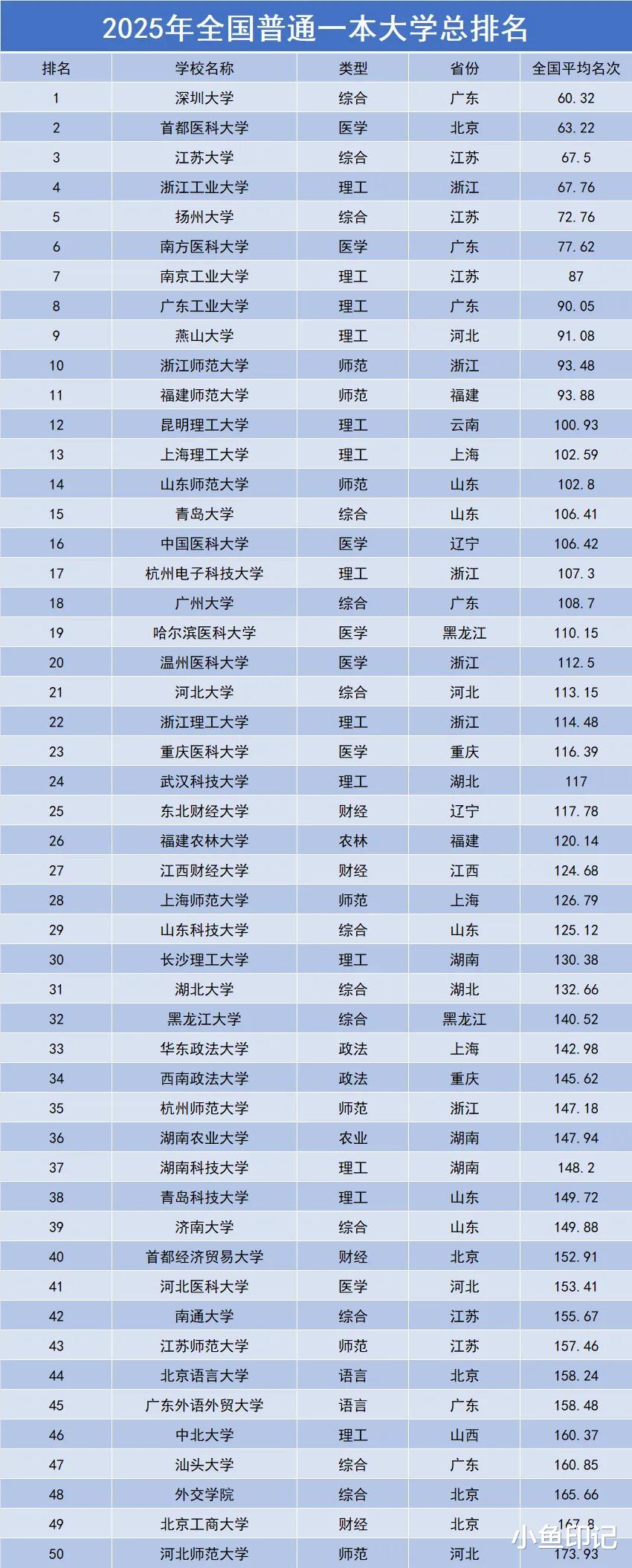 根据第三方机构发布的2025年大学排行榜,包括校友会、软科以及ABC中国等,结合这些榜单的数据,对全国高校进行平均加权排名,这样就得到一个较为靠谱的普通一本高校排名。