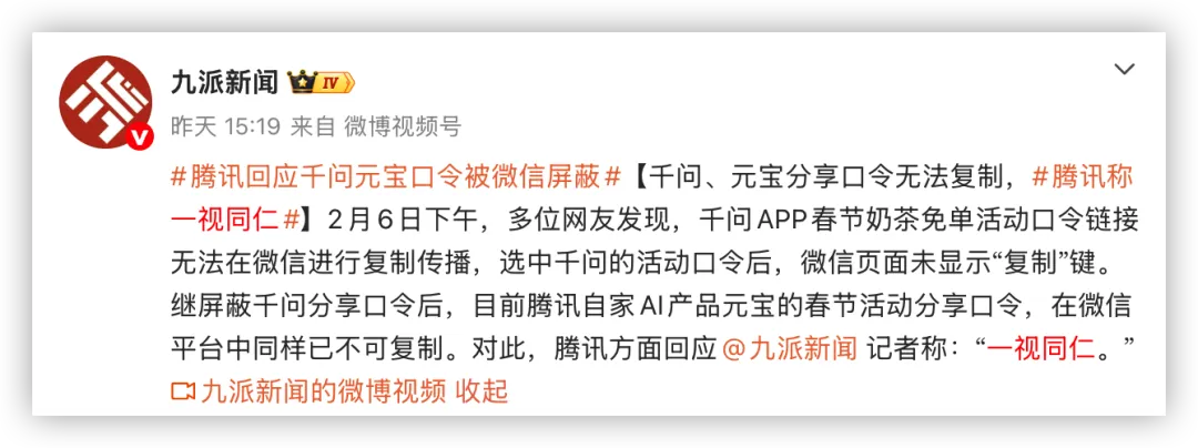为了绕开限制,各家普遍采用了转发口令的形式,尝试在微信内继续传播。