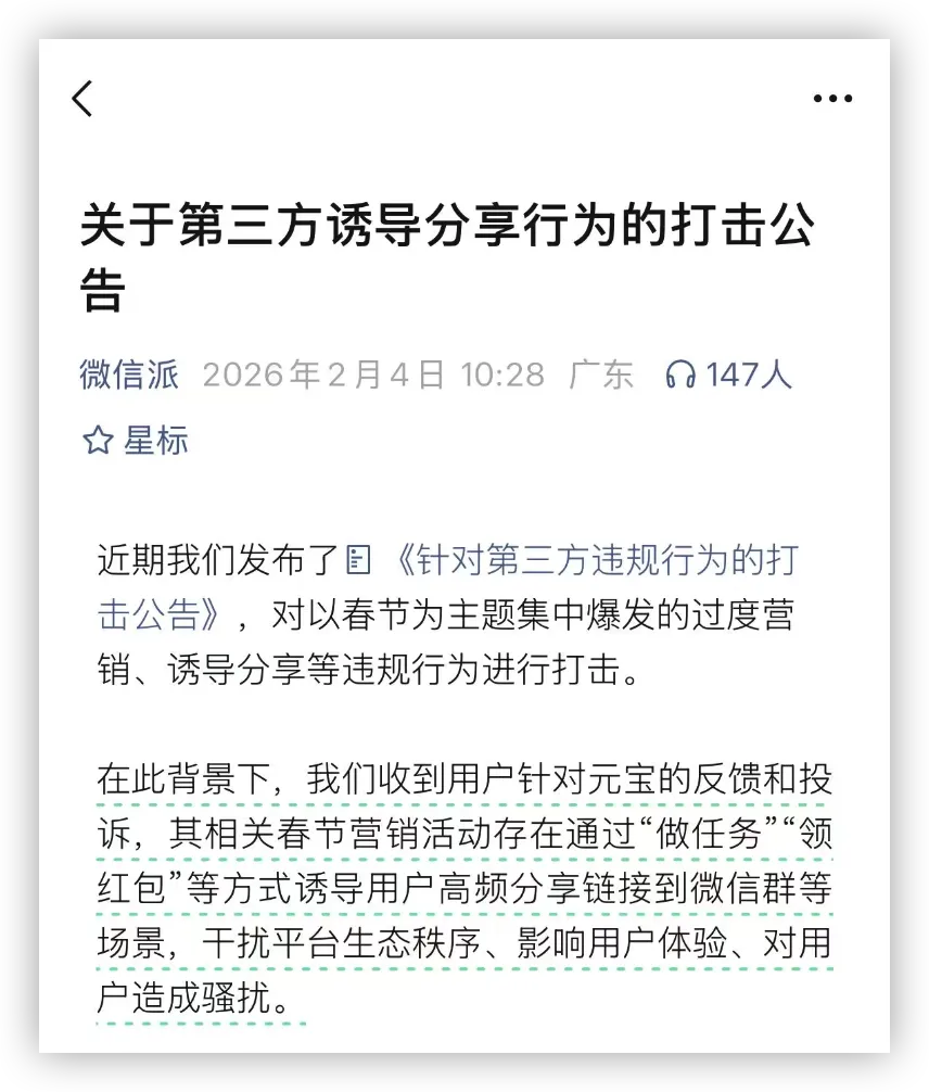 很快,微信安全中心和微信派联合发布了《关于第三方诱导分享行为的打击公告》。