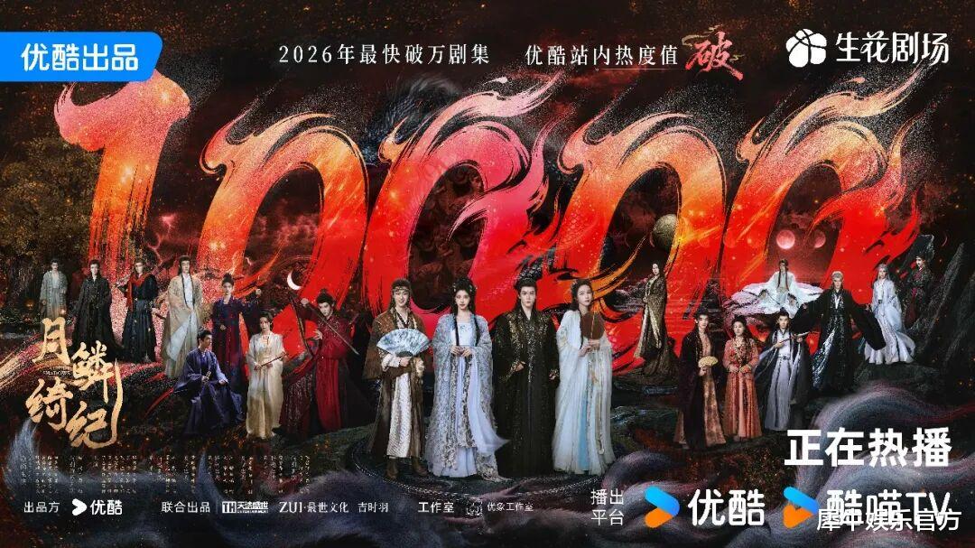 4月3日,在优酷独播的古装奇幻爱情剧《月鳞绮纪》开播52小时后站内热度破万,成2026年最快破万剧集。
