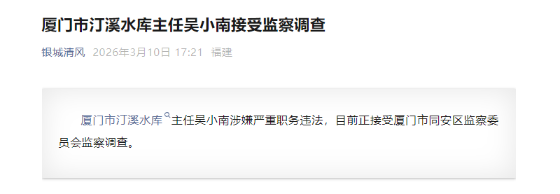 然其久居清流之地,心渐浑浊。以专业之精,掩蠹蚀之巧;借民生之重,行渔利之私。细察其权,皆成弊薮:一曰工程“肥水”。千万加固项目、设备采购,招标标底、中标企业,其笔尖轻点,回扣暗流。二曰经营“暗渠”。工业与民用水费,计量是否精准、收缴是否及时,“糊涂账”中易藏“小金库”。三曰执法“弹性”。水源保护区违建、非法排污,查与不查、罚多罚少,自由裁量,尽可兑现金。四曰资源“私占”。库区土地、水域经营,租赁承包,价低者得,损公肥私。尤可虑者,其单位乃“经费自理”,创收压力之下,更易将公权变现。台上大讲“全面从严治党”,台下或行“全面以权谋私”;人前标榜“守护生命之源”,背后竟将“源头”作“财源”。丙午年正月廿二日(2026年3月10日),厦门市同安区监察委员会公告:吴小南涉嫌严重职务违法,接受监察调查。一纸通报,石破天惊,“大水缸”之管家,终将自己“管”入囹圄。