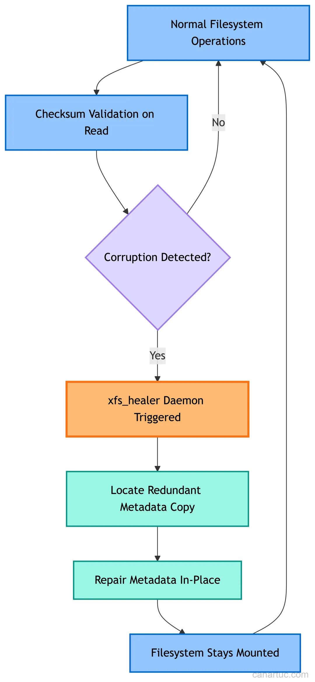 一个新的 xfs_healer 守护进程监控健康事件,并在文件系统保持挂载状态时自动检测和修复元数据损坏。无需停机,无需人工干预。