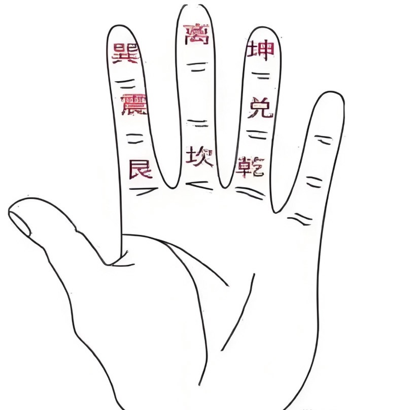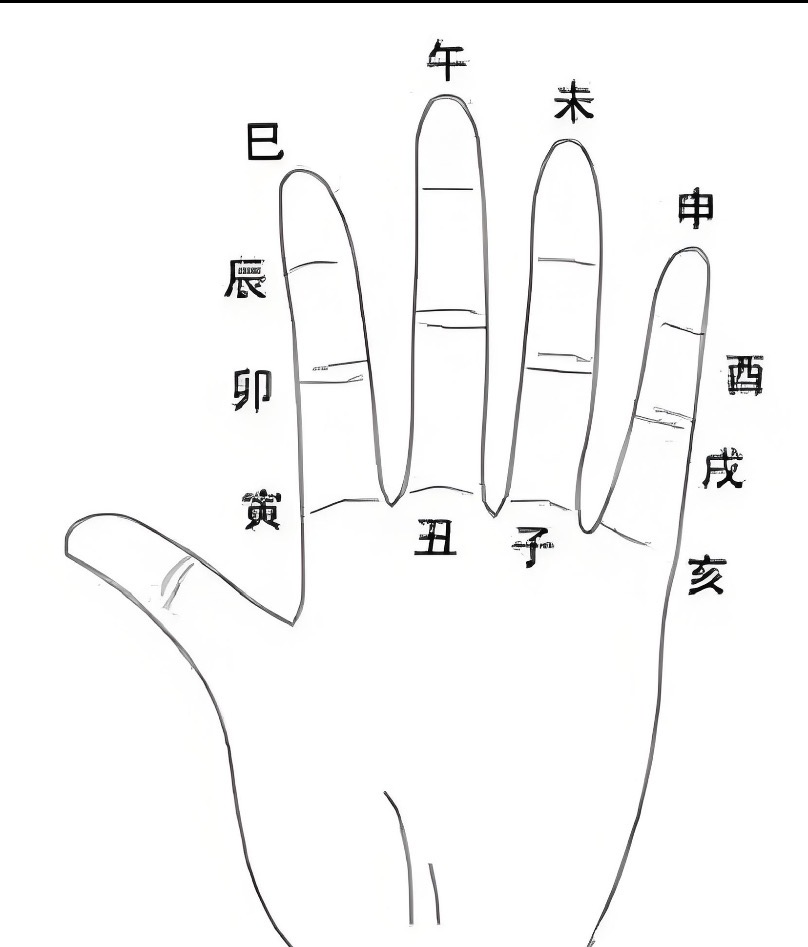如下图,这个有点命理基础的朋友应该都不会陌生,这都是基本操作,十二地支在手上的位置,大拇指来掐,无名指起子,顺时针依次丑寅卯辰巳午未申酉戌亥,用这个来算流年干支,看别人属相什么的还是蛮方便的。