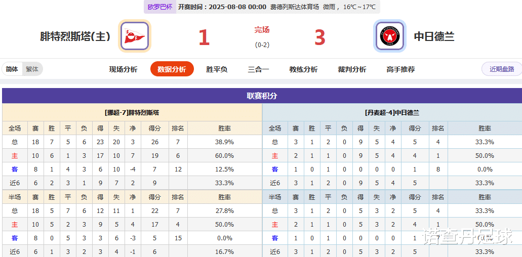 欧冠,欧联以及欧会杯最大的分析问题通常存在于筹码倾向性的判断上,越是更不热门的欧会杯比赛也是如此,1方面联赛不怎么出名,另1方面,球队不怎么知名,再加上如果双方没有过直接往绩交手的话,那么筹码倾向性的判断上将是个天然风险点,再加上如果指数在有些难点,结果便是选项的增加,被动增加,非受迫性增加,这是没有办法的事情,因而凡是分析这类比赛组成的14场比赛,通常来讲,选项数不会低,本期也是如此,客观分析方便之后,3选的,双选的,以及少量的单选,构成了本期14场的选项组合,并不低,虽然都防备到了,但是因为选项数高,因而意义也大打折扣,虽然也在尽可能的减少选项数,但是这个内容和过程有时候受客观比赛分析的影响而并不能做出。下面这场比赛是本期14场比赛中为数不多的单胜平负结果判断的比赛,其它比赛3选的,双选的,主要是因为本期232结构比赛多的缘故。