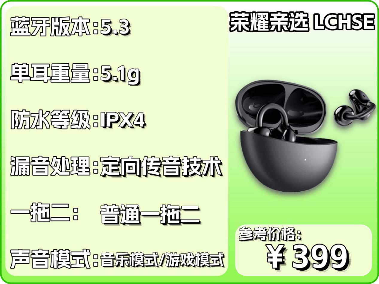 荣耀亲选 LCHSE的单个耳机的重量在5.1克,还有C形桥设计和轻量化设计能更好的优化佩戴不适感。轻盈佩戴的同时能牢固在耳朵上。耳机拥有10.8mm双磁路喇叭和动态低音增强技术,能提高空气感和通透声的同时氛围感体验也不错,耳机搭配了双麦ENC降噪功能的同时还装载了5.3版本的蓝牙芯片,7小时的单耳续航并且搭配耳机仓能来到36小时的续航时长。