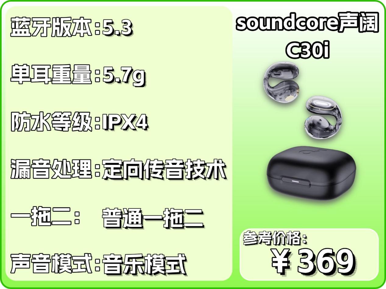 这款耳机的耳挂采用了可拆卸耳翼能适配大多数耳型,且只有5.7克的耳机重量在运动场景也能轻松佩戴。拥有17mm跑道型单元和360°环绕音的soundcore声阔 C30i对低音起伏有很好的优化,高音方面也能做到轻灵不刺耳,氛围感不错,搭配了蓝牙5.3芯片,不仅支持双麦通话降噪和10小时的单耳续航,还提供了一拖二,切换设备很方便。
