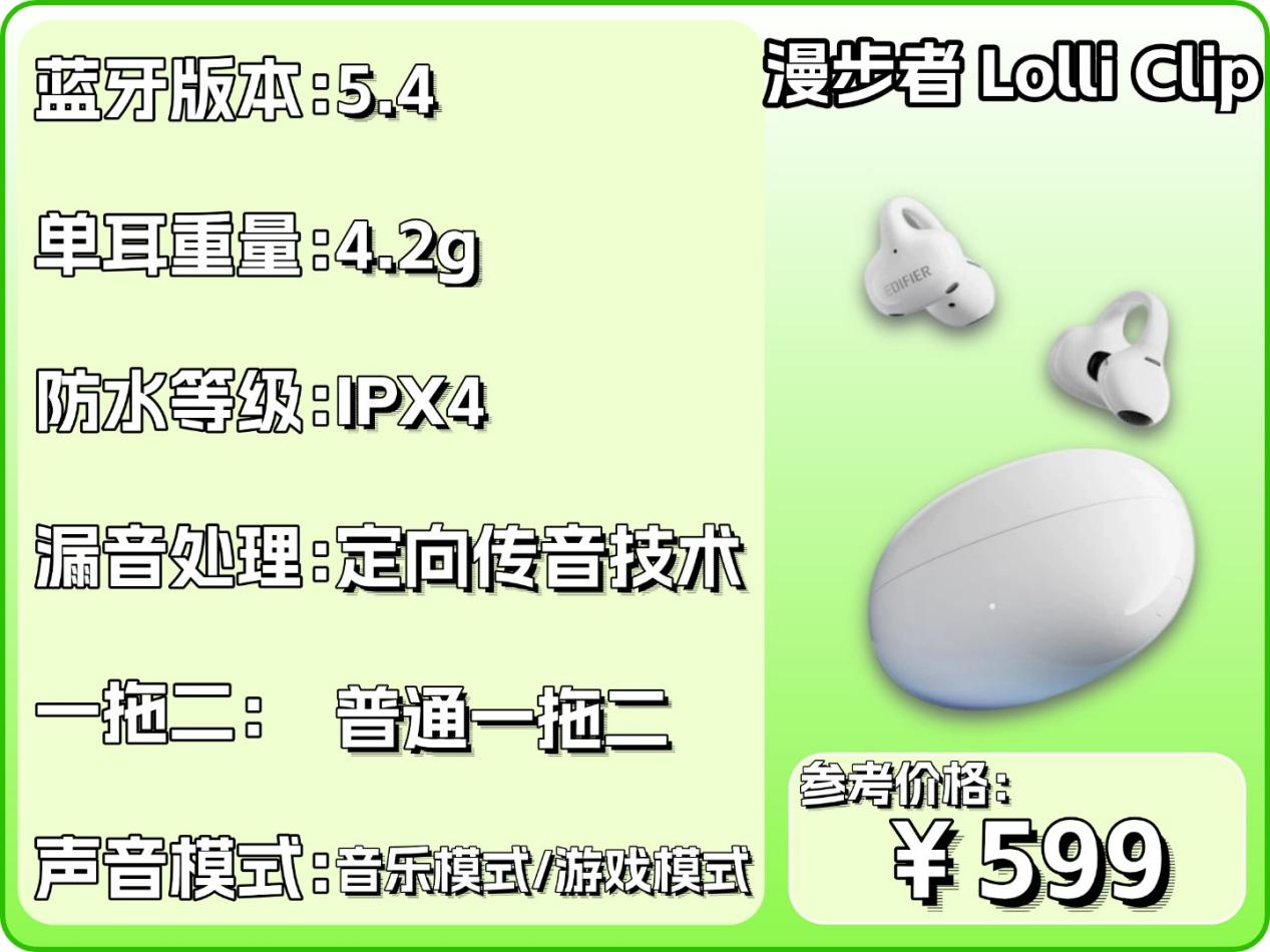 漫步者 Lolli Clip的12°黄金夹角设计能优化耳机佩戴不稳固的问题,并且耳机的重量也只有6.3g,佩戴体验不错,音质方面耳机装载了12mm钛度复合振膜以及BassTurbo低音增强引擎,能很好的区分声音强弱音的过度,精准还原音乐细节。漫步者的防水等级来到了IPX6,且拥有7小时的单耳续航,如果配备耳机仓能来到28小时的续航时长,双麦通话降噪功能在身处杂乱环境的同时你的声音也能很好的传达。