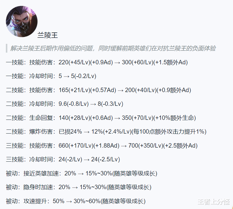 兰陵王前中期削弱,后期加强,嚣张已久的兰陵王终于得到了策划的制裁,这次兰陵王被削了前期的伤害后,不知道在正式服会表现出什么效果。但是兰陵王想在前期一套秒人出节奏应该是不可能了。
