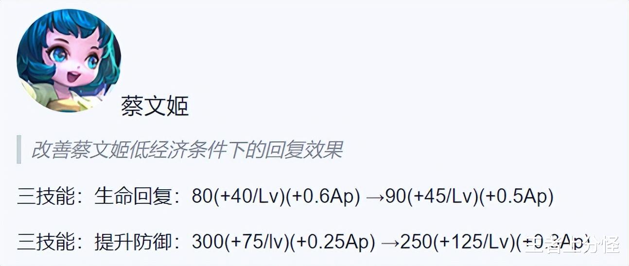 蔡文姬加强,提升了蔡文姬前期三技能的回血能力,平调了三技能前期的防御能力,后期算是加强。